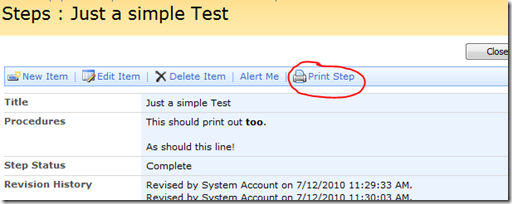 <%@ Assembly Name="Microsoft.SharePoint.ApplicationPages, Version=12.0.0.0, Culture=neutral, PublicKeyToken=71e9bce111e9429c"%> <%@ Page Language="C#" %> <%@ Import Namespace="Microsoft.SharePoint" %> <%@ Register Tagprefix="SharePoint" Namespace="Microsoft.SharePoint.WebControls" Assembly="Microsoft.SharePoint, Version=12.0.0.0, Culture=neutral, PublicKeyToken=71e9bce111e9429c" %> <script runat="server"> protected override void OnLoad(EventArgs e) { try { SPWeb oWeb = SPControl.GetContextWeb(HttpContext.Current); SPList oList = oWeb.Lists[new Guid(Context.Request["List"])]; SPListItem oItem = oList.GetItemById(int.Parse(Context.Request["ID"])); header.Text = oItem.Title; if (oItem["Content"]!=null) { procedures.Text = oItem["Content"].ToString(); } } catch (Exception ex) { Context.Response.Write("Error: " + ex.StackTrace); } } </script> <html> <head> <title>Print Friendly Page</title> <style type="text/css" media="print"> .button{ display:none } </style> </head> <body> <p class="button"> <input type="button" value="Print..." onclick="window.print()" /> <input type="button" value="Close" onclick="window.close()" /> </p> <h1><asp:Literal ID="header" runat="server" /></h1> <asp:Literal ID="procedures" runat="server" /> </body> </html>