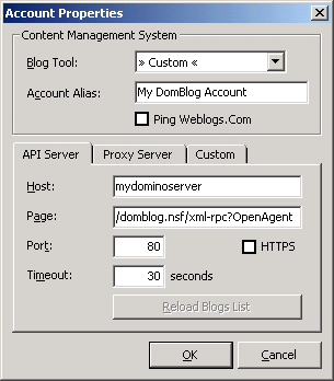 Change the Blog Tool setting to >> Custom << and give the account an Alias that will mean something to you next time you launch w.bloggar. Change the Host field to the address of the server you installed DomBlog on. In the Page field enter the absolute path to the database and append to this the name of the agent to be called.