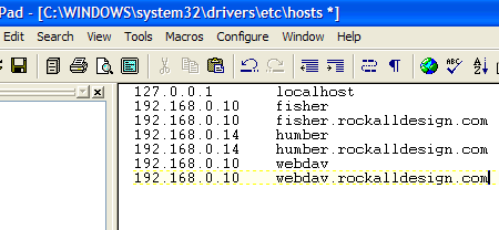 Quite off-topic, but your /etc/hosts file can be streamlined. The syntax is: "IP-address hostname hostname", so "192.168.0.10 webdav.rockalldesign.com webdav" (all one one line) would also do the trick ;-)
