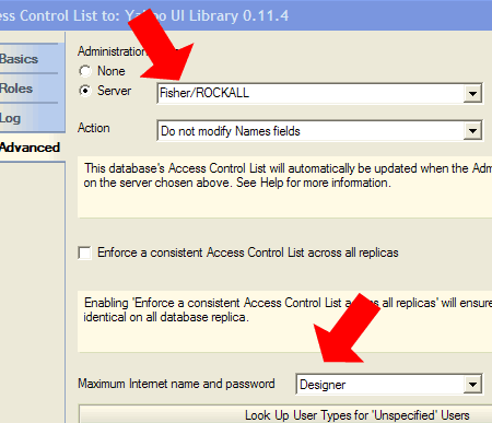 First thi ng to do is allow access to the database we want to work with. Open the A CL's advanced tab and make sure the admin server is correct and that max internet access is set to at least Designer: